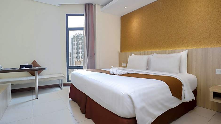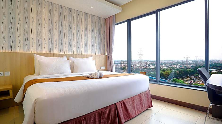 Deluxe Double is 269 square feet and includes a king-size bed 150-183 width and is Wheelchair-accessible.